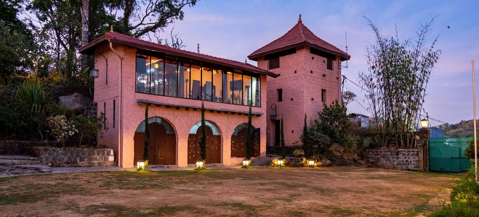 Exterior view of a well-lit building with arches at night, surrounded by a garden.  | Mango Hill, Yercaud